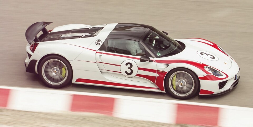 Men først litt glaning: Porsche 918 ser litt dustete ut. En hvit bil med tretall klistret på sidene og på panseret, og vinylrøde tunger som spruter bakover fra frontlysene. Litt som maskara påført i 150 km/t. Porsches mest avanserte og psykotisk raske serieproduserte bil trenger ikke sånn krigsmaling for å tiltrekke seg oppmerksomhet.