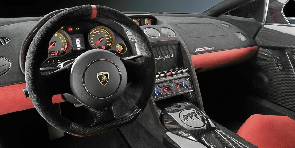 Det er et nytt motordeksel med hurtigutløser, og under finner du en 5,2-liters V10 med 570 hester og 540 Nm dreiemoment. Toppfarten er 320 km/t - som ville vært høyere om det ikke hadde vært for suget fra vingen - og 0-100 er likt med Superleggera: 3,4 sekunder. Med sine 1340 kg er den 70 kg lettere enn den vanlige Gallardoen, men - riktig - den veier nøyaktig det samme som - en Superleggera.