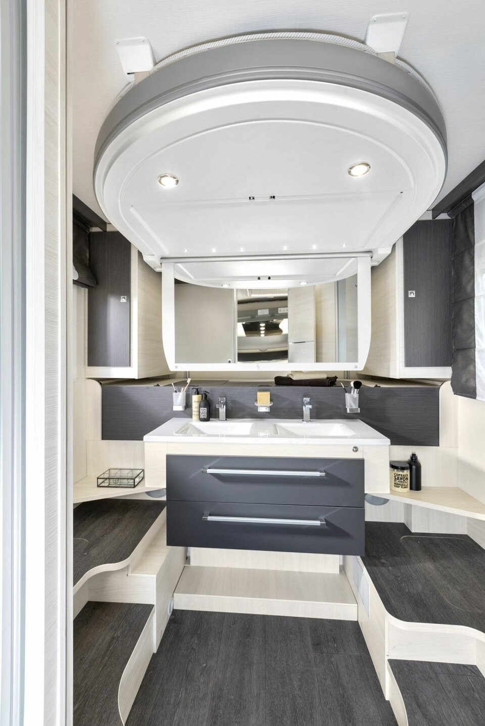 Undersiden av sengen har et digert speil som du kan felle ned. Bak vaskene finnes tre såkalte EasyBox-oppbevaringsrom. Garderobeskap er plassert på hver side av vaskene. Må du på do i løpet av natten, så finnes det et lite bad med toalett og vask på førersiden. Vis-à-vis er dusjen.