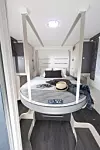 Sittegruppen består av to langsgående sofaer med et fleksibelt bord midt imellom. Dersom du vil se nærmere på Challenger 338 Premium, så vises den på Caravanmessen på Lillestrøm fra 12. til 15. september.