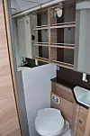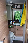 Toalettet har 230-uttak, takventil, vindu som kan åpnes (ikke med frostet glass), kroker og et speil som på elegant vis kan skyves til siden slik at oppbevaringshyllene bak kommer til sin rett. Pluss i margen også for god benplass. Dusjen har sitteplass, stor takluke for god lufting og håndklehengere.