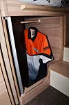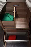 Hva gjelder oppbevaringsplass foruten garasjen, så har Coral Axess i prinsippet tre garderobeskap - to ved fotenden av sengene og et høyt og smalt skap ved siden av dusjkabinettet. Under denne varianten finnes to skuffer. I tillegg har bobilen rikelig med overskap.