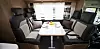 Sosialt samvær i bobiler er noe vi sjelden får anledning til å skrive noe positivt om. Som oftest er det trangt, og det er nesten alltid så som så med sittekomforten. Men det finnes unntak, og to av dem finnes nettopp i denne testen. Først og fremst er komforten god, med et ekstra lite pluss for god korsryggstøtte. Men det er ikke bare sittekomforten som trekker opp totalkarakteren. I begge bobilene er plassen når man skal spise eksemplarisk. Det at fire voksne kan spise sammen uten at det blir trangt gir oss god grunn til å understreke ordet samvær. Carado har dessuten et ekstra ess i ermet. Der har nemlig barna en egen spiseplass. Begge bilene har fire plasser med belter i sittegruppen, justerbare nakkestøtter, perfekt sittedybde (45 centimeter, noe som er nøyaktig hva myndighetene anbefaler), vendbare spotlights, takvindu og 230 V uttak under sofabordet. Skal vi være pirkete, går det ikke an å snu på noen av stolene bak. Dette fører igjen til at bare halvparten av dem som sitter, får gode plasser når det er tid for å se på tv.