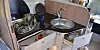 Her har du tre gassbluss, og både vindu og takluke kan åpnes for å få god ventilasjon. 230-uttaket er på plass. Det er også bestikkskuff, kroker, søppelbøtte, tørkestativ for oppvask, god belysning og greit med oppbevaringsplass selv om vi likte skuffene i McLouis bedre enn skapene i Hymers. Ok, volumet i kjøleskapet, Electrolux RM 4400, kan ikke måle seg med det i McLouis (80/12 liter kjøl/frys mot 154/30 liter).