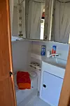 Også på badet har det skjedd en del. Begge har Thetford-toaletter. Den "gamle" har en datidens Porta Potti, mens McLouis har et vendbart toalett med el-spyling. Man kan dusje i begge.