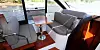 En sikker og velfungerende løsning. Om lysten er til stede kan du også få plass til tre på førerplass. Men da er det mer behagelig å bruke sittegruppen vis-à-vis på babord side. Her er det sofa med og mot fartsretningen med bord imellom. Der kan det også sitte to-tre personer, slik at fire-fem personer fint sitter sammen på lange etapper. Det store soltaket over førerplassen kjøres opp og igjen med en bryter, og gir luft og lys i cockpit. Like mye sommer som i en åpen båt slipper du ikke inn, men så er det til gjengjeld langt lunere på kjøligere eller regntunge dager.