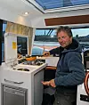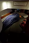 Tilbake i båten et par timer senere er temperaturen en helt annen. Webastoen har gjort en god jobb, så vi ruller ut soveposene og kryper til køys. Fatter'n i kabinen i front, jeg i det som etter hvert skal få navnet «kista» - stikkabinen under cockpit. Bare å komme seg ned dit krever en viss smidighet, og det er med akrobatiske krumspring jeg får tryllet inn min 192 centimeter lange kropp.