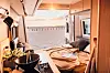 Ved siden av trappeinnsatsen ligger et helt redesignet bad med dusj, og vask som kan vippes vekk. Slik det ofte er i campervans, er kjøkkenmodulen plassert ved skyvedøren. Det er utstyrt med store skuffer og en utvidelsesplate for kjøkkenbenken.