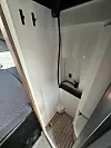 Badet har trekkspilldør, trerist på gulvet og moderne, frittstående vask. Vask og speil er festet til en vegg som kan svinges vekk slik at det frigjøres en dusj. Smått med oppbevaring bortsett to knagger og et lite skap.