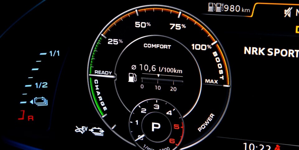 Vi triller ut på landeveisrunden og skjønner straks at Q7 mener alvor med sin oppgitte el-rekkevidde på 56 km. Det sier stopp etter 44 km, ikke minst fordi det på denne delen av testen er mange høydemeter å forsere. Men kombinasjonen av at dieselmotoren både er nøysom og får stå ubrukt drøyt 20 % av turen setter sine spor i forbruket for hele testrunden: 0,50 liter per mil ender vi opp på. Et tall typisk for mange kompaktbiler med 1,6-liters dieselmotor.