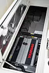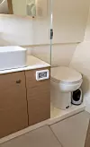 Førerplassen har to gode pilotstoler og stort dashbord med plass til det du måtte ønske av skjermer. Via CZone-systemet styres de fleste funksjonene om bord – en skjermbasert løsning som reduserer antall brytere. Hovedenheten er plassert i kabinen på babord, trygt bak låst dør.