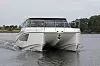 Vi passerer broåpningen i Kappeln sammen med en armada seilbåter, og tøffer rolig ut Schlei-elven mot bukten mellom Danmark og Tyskland. Allerede ved lav fart merker jeg katamaranens stabilitet med mindre rulling enn en V-bunnbåt, og hekkbølgen i fem–seks knop er minimal.