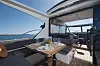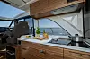 I salongen kan opptil åtte personer samles til måltid når været ikke spiller på lag. De smarte kalesjegardinene trekkes raskt rundt akterdelen, og den store skyvedøren samt senkbart vindu skaper sømløs overgang mellom ute og inne.
