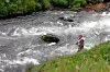 Vi begynte å fiske på skift i Berghylur hvor elva snevres sammen av en fjellknatt på den ene bredden. Hølen er dyp og strømmen tung. Idet vi begynner å fiske er det en laks oppe og slår på brekket. Jeg lar en rød Frances på liten, gullfarget treblekrok svinge noen ganger over fisken, men den vil åpenbart ikke være med på leken, så vi konser på sjørøya.