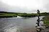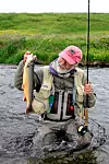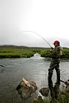 Uansett vær - vi dro i alle fall til spennende Arnarvatnsheidi i vest med mengdevis av små og store vann med røye. I de svingete elvestubbene mellom vannene vaker det stor ørret. Det var det som lokket oss hit selv om veien går i ulende over knudrete lavasletter og vadesteder i steinete elver. Vel framme kunne vi imidlertid slå fast at de spennende elvestubbene var forvandlet til sildrebekker, og at ørreten nok hadde fortrukket til de grunne vannene. Her pisket imidlertid en stø vestavind med kuling i kastene opp såpass med slam og sand at vannet var klart som café-au-lait. Forholdene var håpløse for fluefiske, men de hyggelige islendingene vi møtte, visste råd; de fisket med lange, kraftige haspelstenger, digre dupper og makrell som agn. Og de tok flotte ørreter som luktet seg fram til agnet i det grumsete vannet.