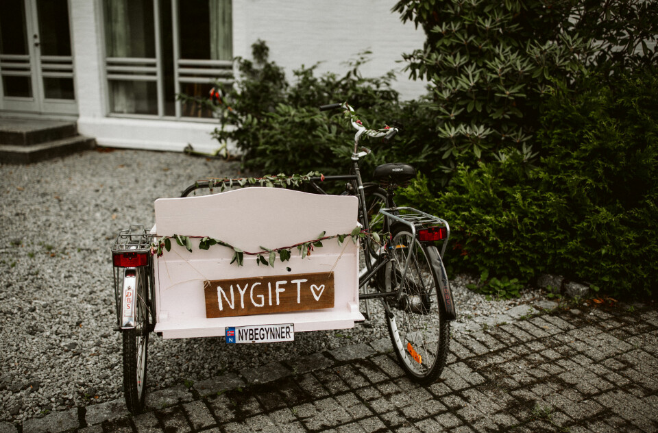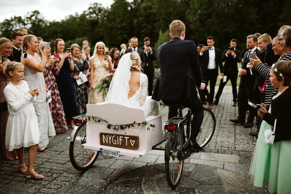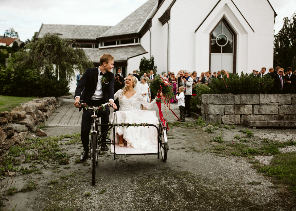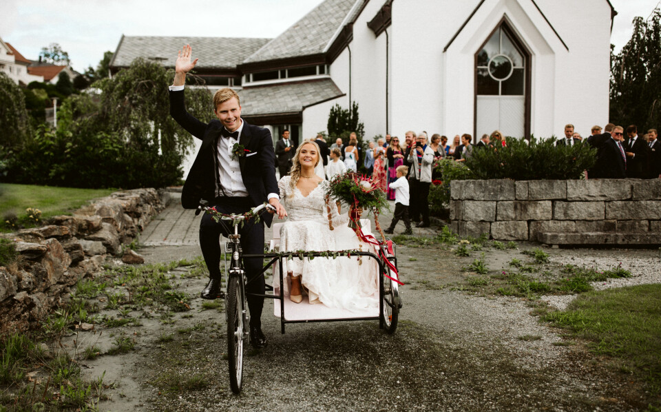Camilla og Ole Martin valgte å feire kjærligheten med venner og familie i Camillas hjembygd på Vestlandet, og med hjemmesnekra sykkel som transport.