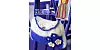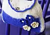 Hekle 2 hvite og 2 blå blomster. Fest alle løse tråder pent på vrangen. Sett 1 liten knapp i midten på hver blomst og fest blomstene til vesken.