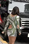 Den 34 år gamle stjernen kompletterte den sølv- og grønnskimrende kjolen med et par sølvfargede stilettsandaler fra sin egen «Disco»-kolleksjon.