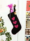Velg filt i de farger som familien liker best, så blir det et personlig klenodie. Materialer: 0,5 m hobbyfilt til selve sokken, små stykker hobbyfilt til dekorasjon, en saks, en stor nål og moulinègarn i en farge som synes tydelig på sokken. Fremgangsmåte: 1. Klipp ut 2 stk sokker og 3 hjerter etter mønsteret i hver sin farge filt. Klipp et lite stykke til en hempe. Legg hjertene under hverandre på den ene sokken, sy dem på med store ujevne sting og hel tråd i moulinègarn. 2. Legg sokkene sammen og sy dem sammen med knapphulssting. Stikk nålen inn fra baksiden ca. 0,5 cm fra kanten og trekk halvt igjennom, så det danner en løkke. 3. Fortsett tungestinget ved å føre nålen igjennom løkken bakfra, trekk stinget til, og gjenta det hele veien rundt i sokkens kant. Husk å sy med stroppen øverst. Hvis tungestinget ikke holder godt nok på stroppen, kan du sy den bedre fast med et par ekstra sting med sort sytråd.
