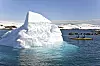 Etter hvert som målet nærmer seg, ligger flere og flere isfjell og skvulper i overflaten. Så dukker snødekte fjelltopper opp på horisonten, nærmest som silhuetter.