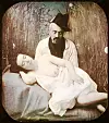 avslappet: Røyke, vaske føttene og vise fram puppen. Kvinner er som kjent i stand til å gjøre mange ting på én gang. Daguerrotypi, 1850. De første erotiske fotografene holdt til i Paris.INA