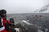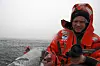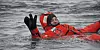 Heldigvis får vi vel si, for ingen av oss er isbadere, eller tøffere enn folk flest, skal badingen foregå med fullt survival kit - overlevingsdrakt. Ikke veldig behagelig å ha på seg, men så snart legemet duver av gårde i sju knop ute på strømmen, er alle bekymringer glemt selv i null graders vann. Dette er bare kult - ja, egentlig ganske rått også.