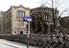 INVASJONEN 1940 I FARGER: Tyskerne marsjerer på Karl Johans gate, 9. april 1940.Henriksens og Steen