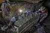 Vi følger en smalsporet skinnegang. Jhonny forteller at fire unge menn arbeider noen hundre meter lenger inn i fjellet. Luften føles tung og tett, men innimellom kommer det drag av friskere luft.