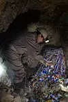 Plutselig peker Jhonny vei inn i en sidegang fra hovedtunnelen. Det begynner virkelig å bli ubehagelig trangt. Jeg må ta av meg sekken og krype for å komme videre. Det føles ikke trygt.