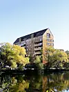 Det alminnelige er å bruke trespon som kledning på privatboliger, men dette leilighetskomplekset i Sverige viser at trespon også fungerer som ytterkledning på et større bygg.