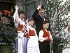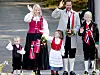 Mette-Marit, prins Sverre Magnus (6) og kronprins Haakon (38) har den mørke varianten av bunaden fra hjemstedet.