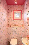Gjestetoalettet i første etasje er prydet med rosa fugletapet.