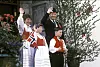 BUNADFAMILIEN I ASKER: Den daværende kronprinsfamilien vinket til barnetoget på Skaugum på nasjonaldagen i 1981. Både Sonja og barna var ikledd sine Asker-bunader, mens kronprins Harald som vanlig var kledd i dress, det fremste festantrekket for menn.Erik Thorberg NTB