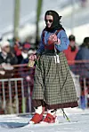 DRONNING SONJA: Rondastakken har dronning Sonja brukt ved mange anledninger, både ved høytidelige og mer uformelle tilstelninger. Her fyker dronningen nedover bakken under det såkalte «Kjerringsleppet» i pausen under storslalåmrennet på Hafjell under OL på Lillehammer i 1994. Den blå skjorta og det grå forkleet er til hverdagsbruk.Pål Hansen / NTB scanpix