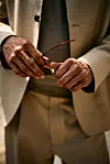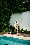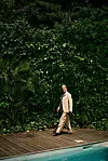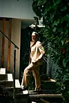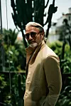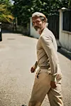 Og den er virkelig beige, den dressen han nettopp har vært inne og skiftet til etter frokosten sin, og som virker skreddersydd til ham. Buksene, lange, draperende, lett flagrende, beveger seg før han selv gjør det. Under jakken har han på seg en tynn, grålig strikkegenser, og skoene; sarte, brune loafers i mykt, mykt lær, brukes uten sokker, naturligvis.
