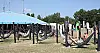 Av dem som klarer å styre seg litt for solbading og varme, er det flere som bruker det lille av skygge de klarer å finne. Under de store innretningene som egentlig er ment som bord, har folk gjemt seg unna for å spise mat.