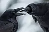 RAVNE-ROMANTIKK: Ravnenes hekkesesong starter midt på vinteren. Ravne-par holder mest sannsynlig sammen hele livet, og liker som oss mennesker å utveksle gaver til hverandre, som for eksempel mose, kvister og småstein. Dette bildet vant i klassen for "oppførsel fugler" og er tatt av kanadiske Shane Kalyn.Shane Kalyn/2021 Wildlife Photographer of the Year